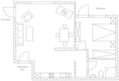 Wohn-/Essraum mit TV, angrenzender Küchenzeile, einem kleinen Flur, von dem es zum geräumigen Schlafzimmer mit dritter Schlafmöglichkeit und zu einem Badezimmer mit Dusche/WC geht. Die Wohnung liegt im Erdgeschoss des Hauses und hat zwei Zugänge zur Terrasse.